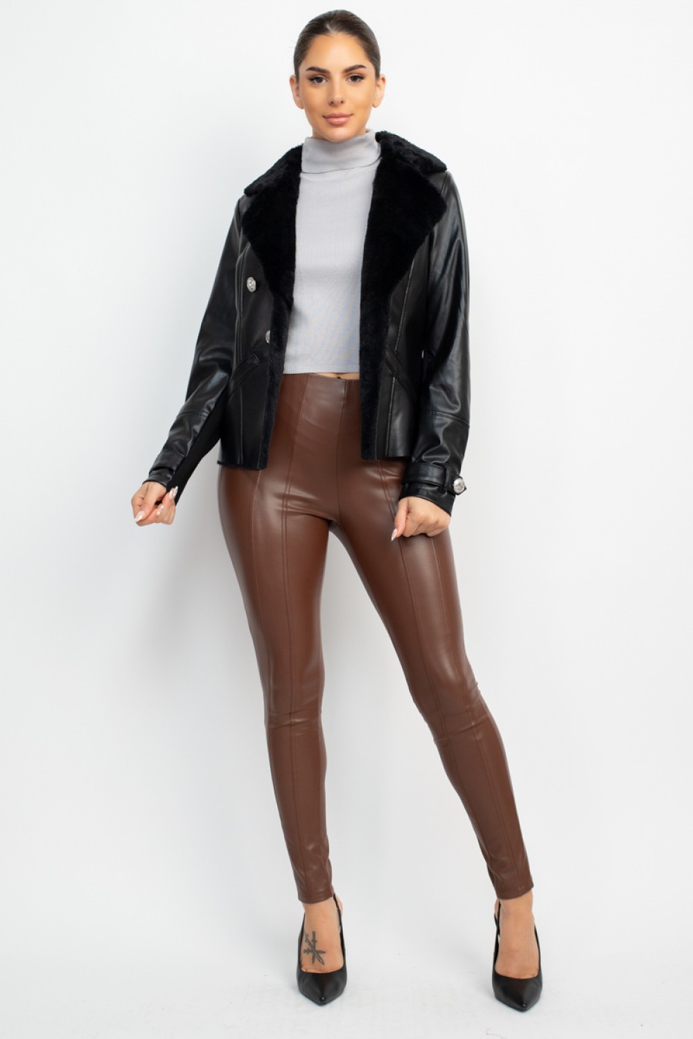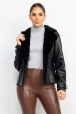 This runway-worthy faux leather jacket exudes bold sophistication with its luxurious faux fur notch lapel, adding a touch of glamour to the edgy design. The button details along the lapel create a refined accent, while the long, seamed sleeves enhance its sleek silhouette. Featuring practical pockets and an open-front style, this waist-length jacket strikes the perfect balance between chic elegance and high-fashion attitude, making it a standout piece for any fashion-forward wardrobe.