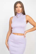Turtleneck Sleeveless Top & Skirts Sweater Set A chic allure sweater top made with elastic material featuring a turtle neckline, solid color, sleeveless, and crop length.