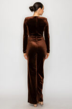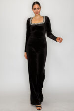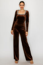 This long sleeve jewel trim jumpsuit features a smooth, dense surface with a soft, slightly cushioned feel that sits comfortably against the skin. The silhouette is elongated and form-skimming, with a fitted bodice that flows into a straight, floor-length cut for a sleek and polished look. The neckline is square-shaped and accented with jewel embellishments arranged in a uniform trim, adding structured detail and light-reflecting texture. The knit construction provides gentle stretch for ease of movement, while the long sleeves maintain a consistent, streamlined finish that balances the overall design.